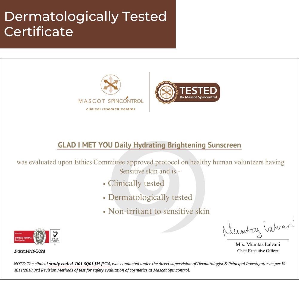 "Discover assurance in every application – Glad I Met You stands as the market pioneer with the first-ever dermatologically tested & SPF Tested Sunscreen. Our stringent testing ensures both safety and effectiveness, establishing us as the forefront choice for your Skin care expedition.